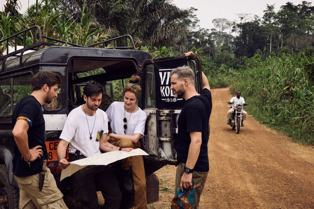 Wir haben die Zivilisation hinter uns gelassen und tauchen immer tiefer in den Dschungel von Kamerun ein. Die Strassen sind nicht mehr geteert, sondern bestehen aus einem Mix aus tief rotem Lehm und Kies. Die Luft ist feucht und der Himmel ist von einer dicken Nebelschicht bedeckt. Wir haben keinen Handyempfang mehr und sind komplett auf uns alleine gestellt. Lediglich eine grobe Landkarte von Kamerun zeigt uns den Weg. Über uns kreisen grosse Vögel und von allen Seiten ertönen unbekannte Geräusche. Wir sind gespannt auf das, was uns noch erwarten wird. Gleichzeitig haben wir alle langsam aber sicher ein mulmiges Gefühl, da wir tatsächlich dem Dschungel, von welchem wir schon so viele Räubergeschichten gehört haben, immer näher kommen.